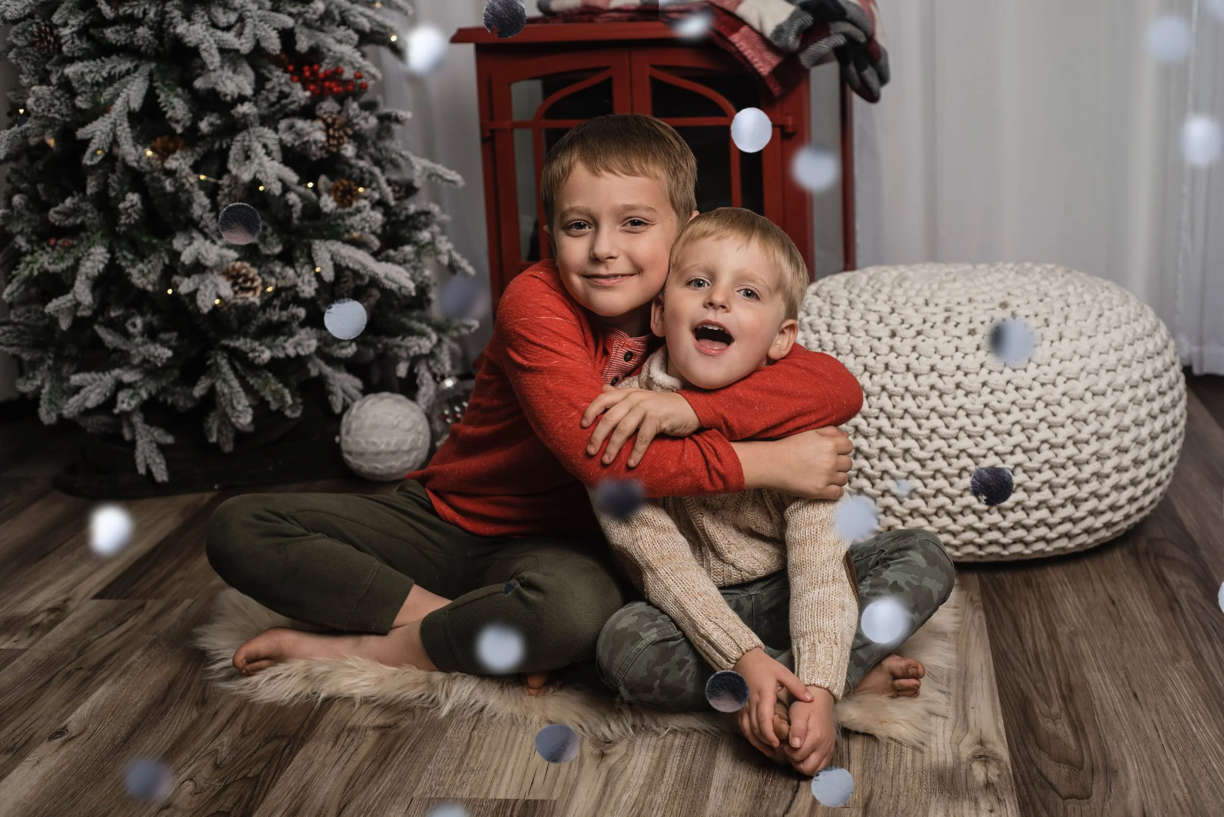 Give them something to smile about! Fifteen minute sessions where we’ll get some classic portraits, then fling sparkly silver confetti in the air, for some not-so-classic portraits while your family has a fun experience. Your choice background colors (white or dark chocolate brown), with the same great holiday setup.